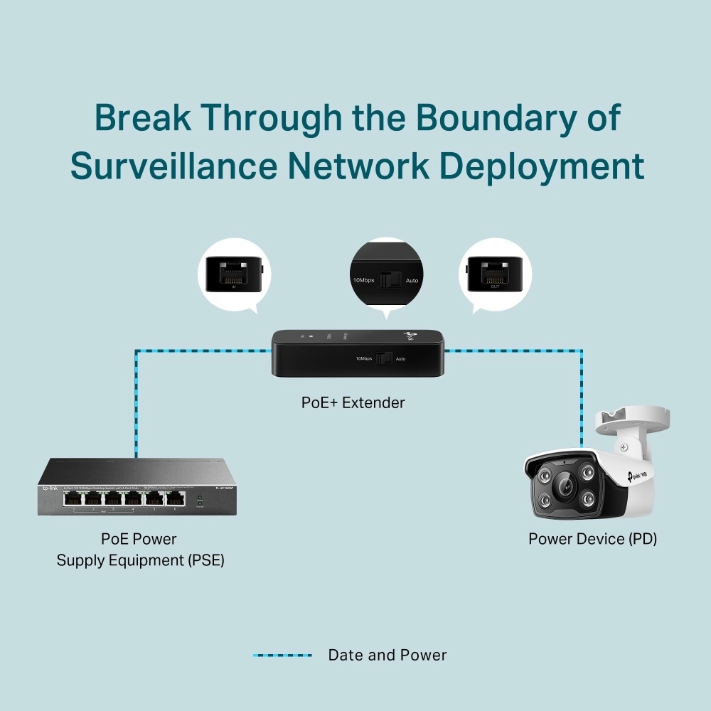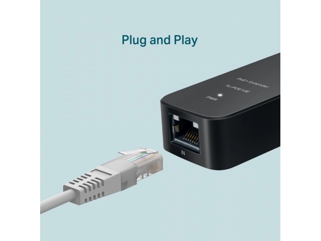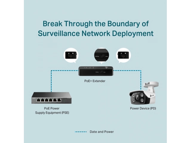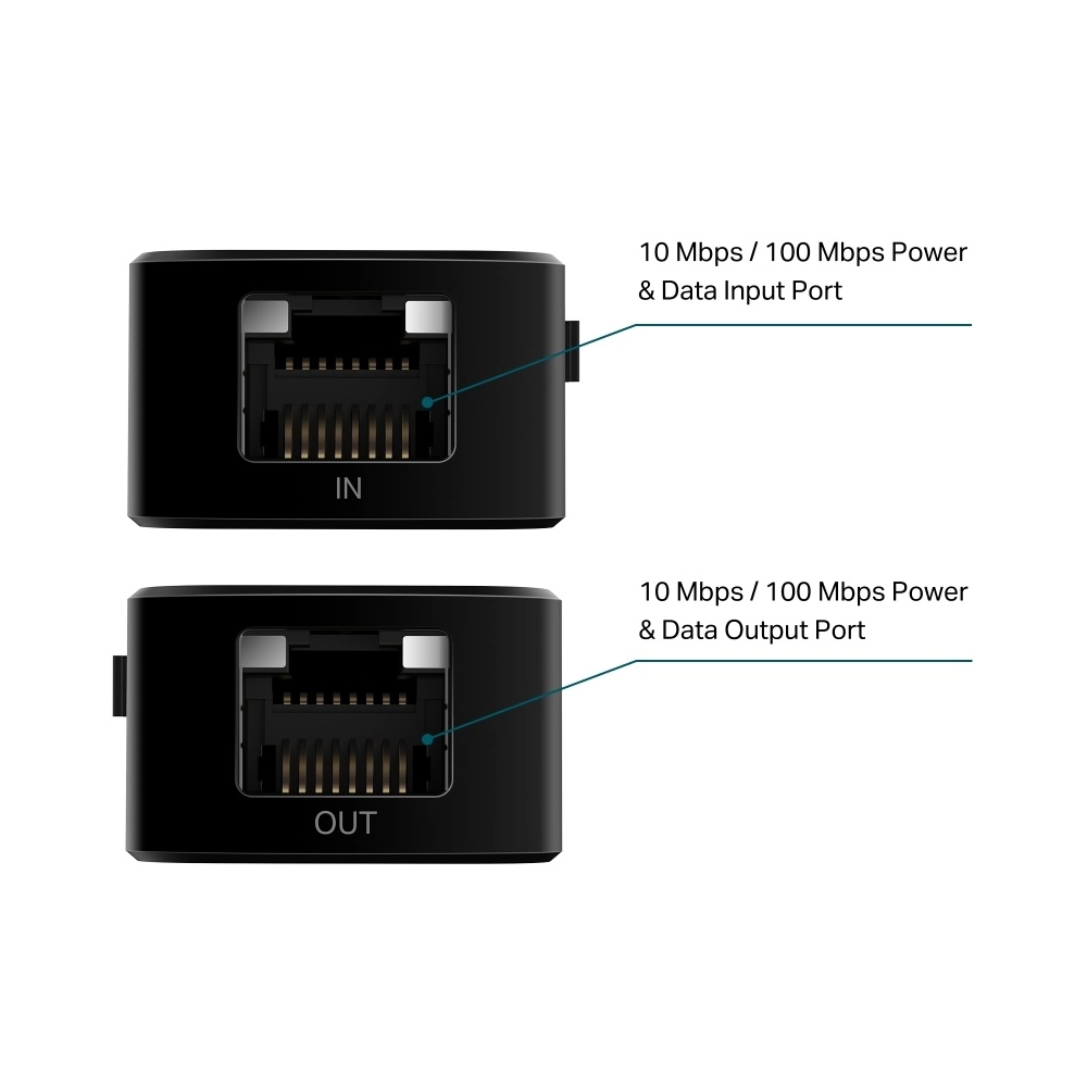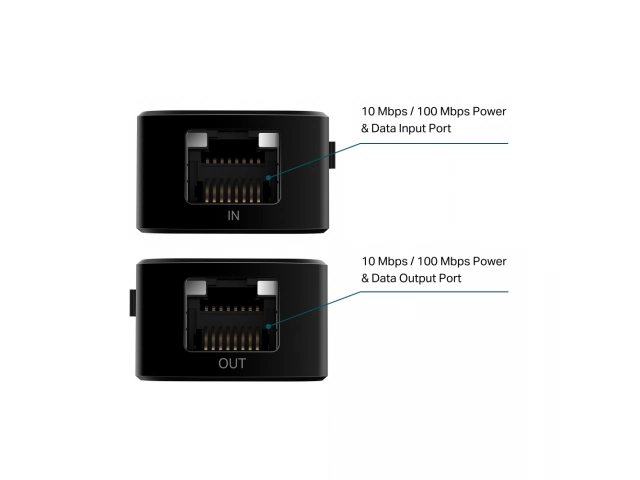- Extiende una conexión de red PoE/PoE+ 100m – 250m adicionales (Modo 10 Mbps) desde el equipo de fuente de alimentación PoE.