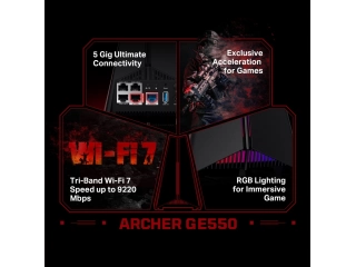 Wi-Fi ultrarrápido para juegos de hasta 9220 Mbps: Con 5764 Mbps en la banda de 6 GHz, 2882 Mbps en la de 5 GHz y 574 Mbps en la de 2,4 GHz, el Archer GE550 siempre está listo para las batallas más feroces. Mantén tu juego en marcha con la banda de 5 GHz dedicada para juegos, liberándote de la competencia con el streaming Netflix 4K de tu familia.