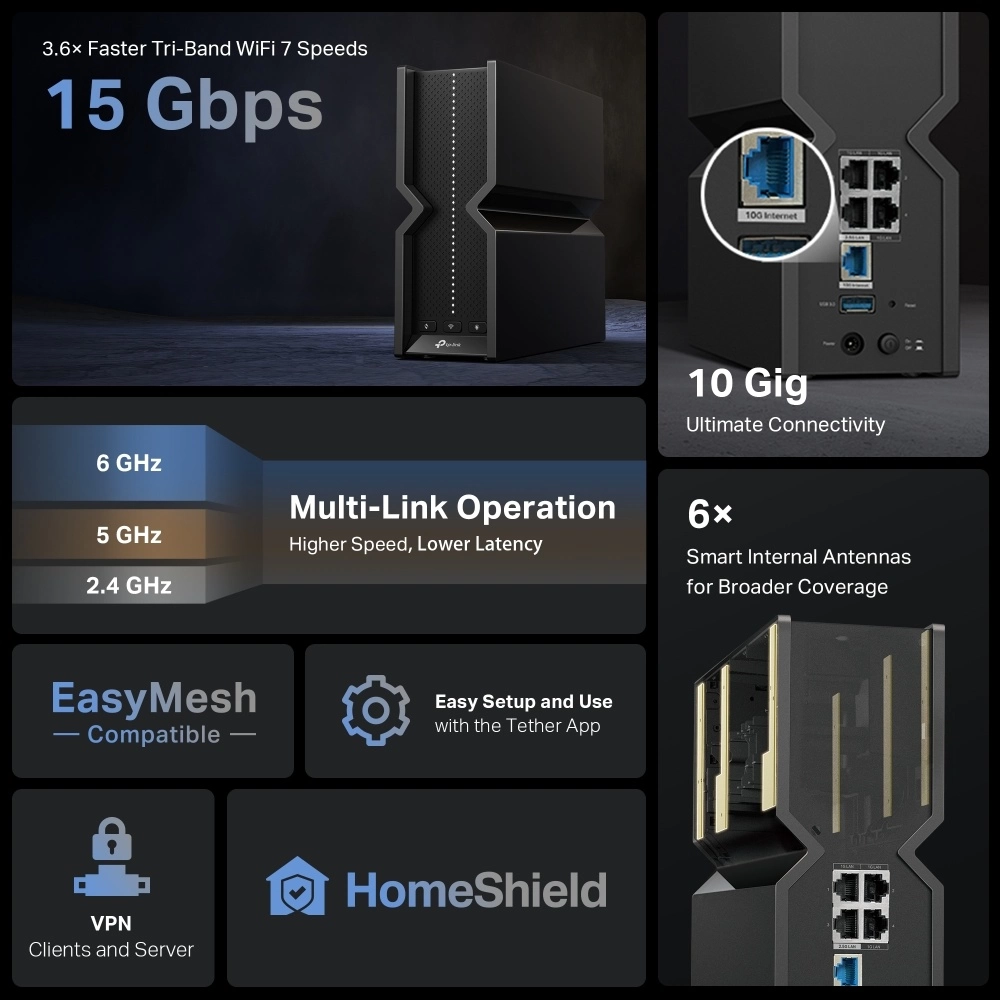 Router, TP-Link, Archer BE700, BE15000, WiFi, 7, Tri-Band, 6 GHz, 5760, 5 GHz, 22882, 2.4 GHz, 688 Mbps, Puertos Gigabit, 6 Antenas de Alto Rendimiento