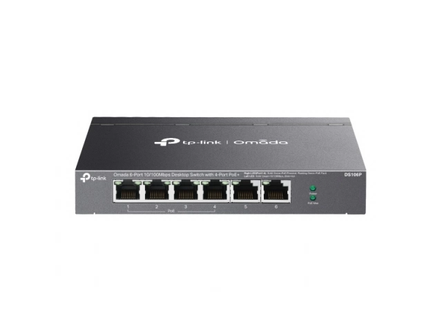 Marca: Omada Modelo: DS106P Tipo: Switch PoE+ Carcasa: Metálica Puertos: 6 puertos RJ45 de 10/100 Mbps (los puertos 1 a 4 admiten PoE+ 802.3af/at) Plug and play: Sí
