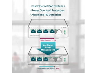 - Admite alimentación PoE de hasta 41 W para todos los puertos PoE.
