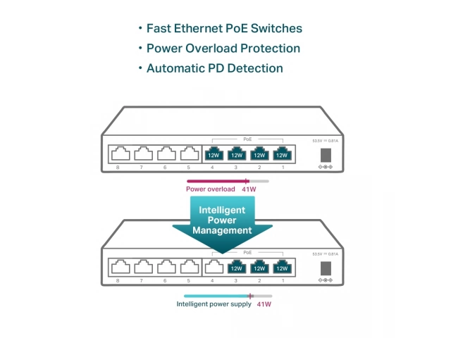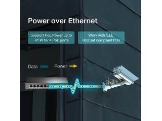 • 8 puertos RJ45 a 10/100 Mbps (4 de ellos son PoE que transfieren datos y energía en un solo cable).