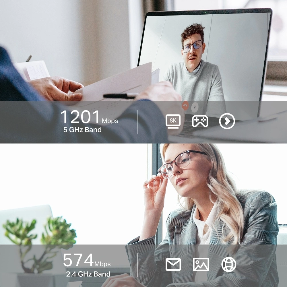 Dual Band. 5 GHz (1201 Mbps), 2.4 GHz (574 Mbps). USB 3.0.