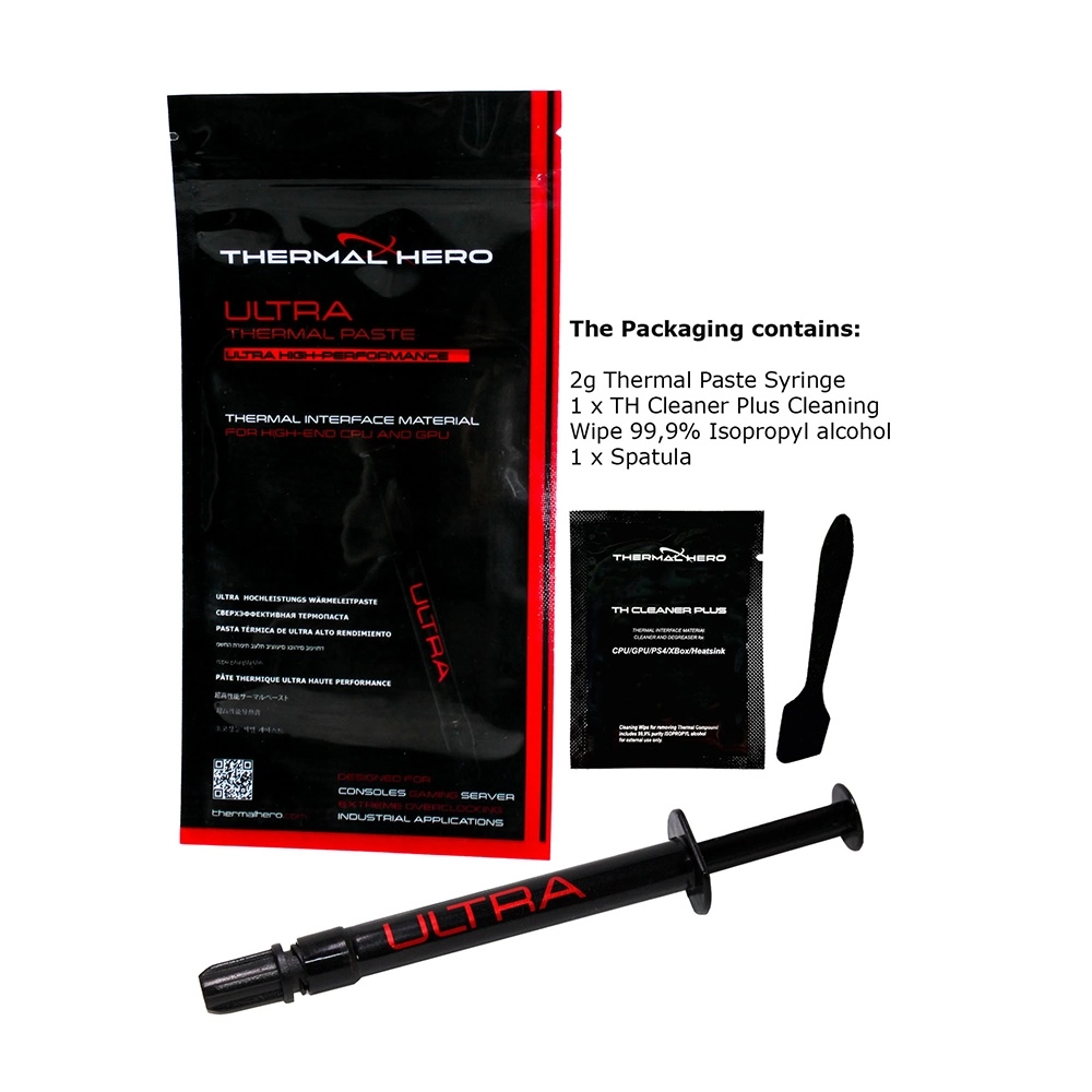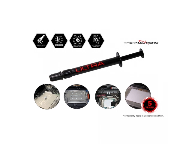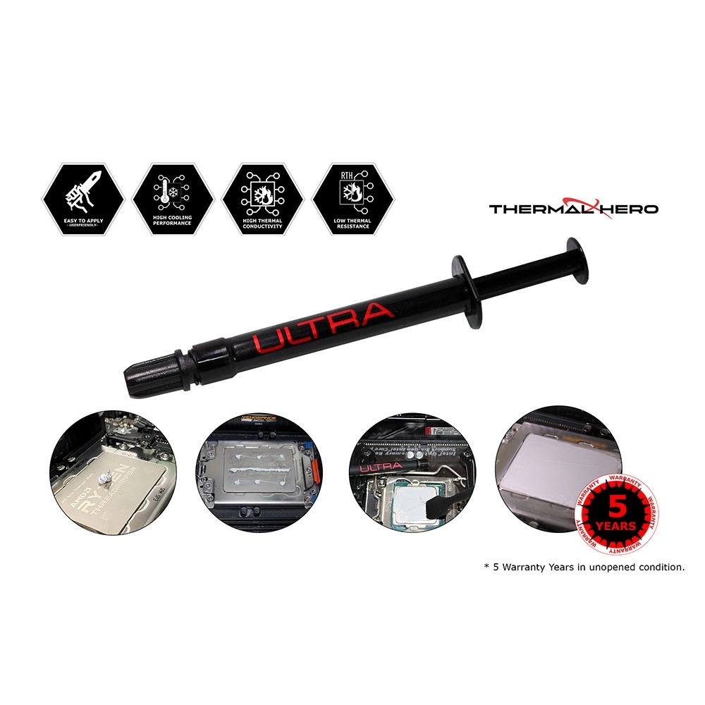 Rendimiento de Enfriamiento Ultra Alto: La pasta térmica Thermal Hero ULTRA destaca por su excepcional capacidad de enfriamiento, gracias a su resistencia térmica muy baja y alta conductividad térmica. Esto la hace ideal para mantener temperaturas óptimas incluso en condiciones de alta demanda de CPU.