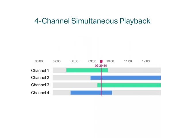 Reproducción simultánea de 4 canales: Reproduce la señal de hasta 4 cámaras al mismo tiempo. Aumente la velocidad de reproducción y encuentra eventos para revisar más fácil y rápidamente cada uno de los vídeos.