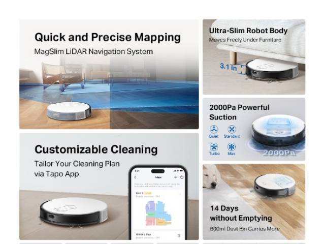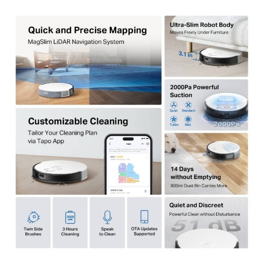 Aspiradora, Trapeador, Inteligente, Robot, TP-LINK, Tapo RV20, navegación, LiDAR, MagSlim, Programa, limpieza, personalizado, succión, cuatro, 4, niveles, 3 hs, Carga, automática