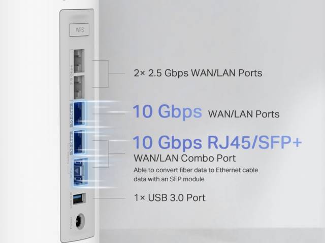 Red de 10 Gbps sin precedentes: 1 puerto WAN/LAN combinado Ethernet/fibra de 10 Gbps + 1 puerto WAN/LAN de 10 Gbps + 2 puertos de 2,5 Gbps garantizan la máxima flexibilidad y un mayor rendimiento.