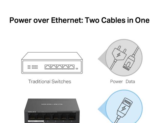 Dos cables en uno: Con cuatro puertos PoE+, transfiere datos y alimentación en un solo cable.