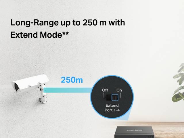 Largo alcance hasta 250 m: Aumenta la distancia de transmisión PoE hasta 250 m mediante el modo Extend.