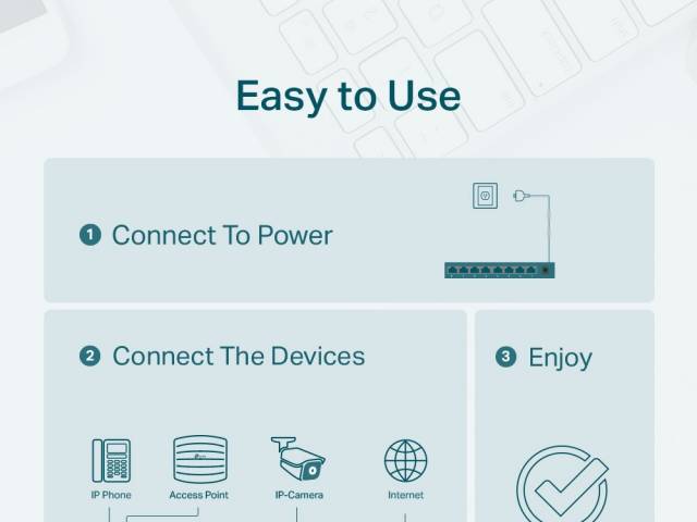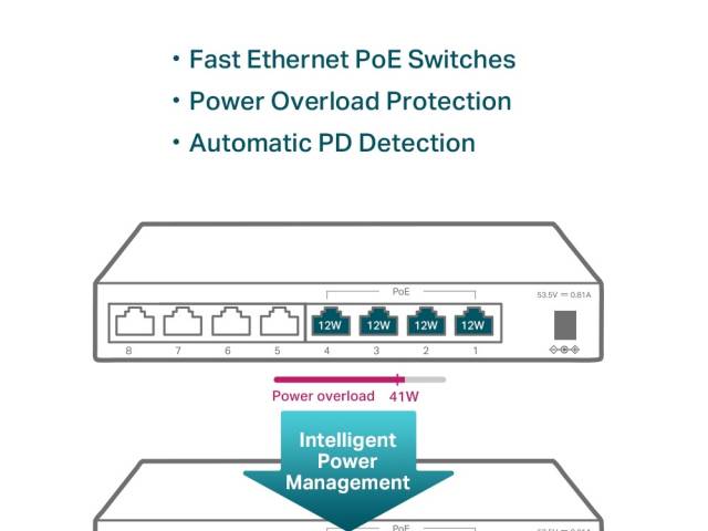 - 8 puertos RJ45 a 10/100 Mbps (4 de ellos son PoE que transfieren datos y energía en un solo cable).