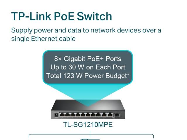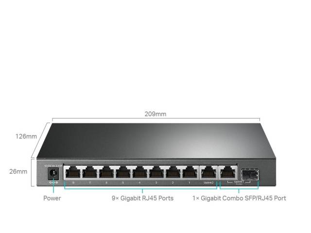 Switch, TP-LINK, TL-SG1210MPE, 9 Puertos, Gigabit, 1 Puerto, SFP, Gigabit, 8 Puertos, PoE, Administrable, Carcasa Metalica